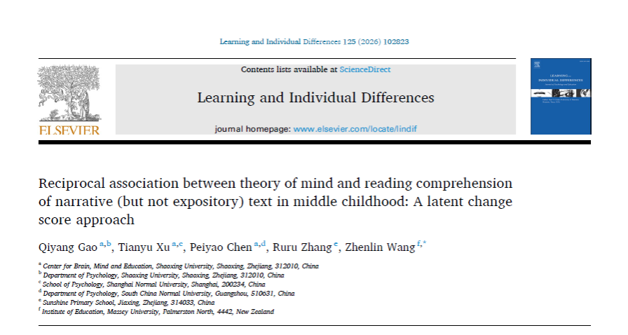 为解开这一谜题,绍兴文理学院大脑、心理与教育研究中心高奇扬课题组联合新西兰梅西大学王贞琳团队,开展了一项为期一年的纵向追踪研究,系统探索了儿童心理理论与不同文体阅读理解能力之间的动态关系。目前,该研究成果Reciprocal association between theory of mind and reading comprehension of narrative (but not expository) text in middle childhood: A latent change score approach”已在国际知名学术期刊Learning and Individual Differences(SSCI收录,JCR Q1,IF=9.0,中科院1区top)在线发表。