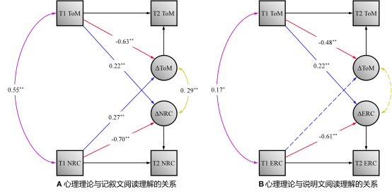 研究结果发现,心理理论仅与记叙文阅读能力呈现出显著的双向促进作用。初始心理理论水平高的孩子,在记叙文阅读理解方面进步更快;而初始记叙文阅读能力较强的儿童,其心理理论发展速度也更快(图1A)。研究者指出,记叙文中富含人物互动与心理状态描写,如同一个“社会认知的模拟场”,儿童在阅读过程中不断推测角色意图与情绪,从而锻炼并提升了心理理论能力;反过来,心理理论的发展又帮助孩子更深入地理解人物动机与情节发展,形成“越读越懂,越懂易读”的良性循环。相比之下,说明文虽不直接刻画人物心理,但其对因果推理、元表征等高级认知能力的需求,使其同样受益于心理理论所支撑的复杂推理能力(图1B)。该研究创新性地采用潜变化分数模型,在纵向框架下揭示心理理论与记叙文阅读理解之间存在“双向促进”关系,而与说明文阅读理解之间仅表现为“单向预测”。