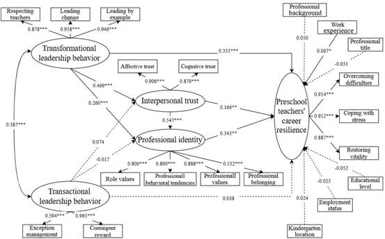 领导行为效应分化:园长的变革型领导行为(如愿景激励、个性化关怀、智力激发)能显著且正向地预测教师的职业韧性。相比之下,以条件奖惩和事务管理为核心的交易型领导行为,则与教师职业韧性无显著关联。