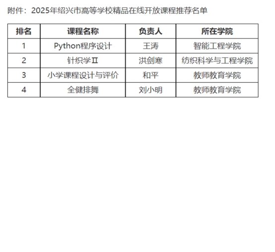 经教师个人申报、学院推荐,学校组织专家评审,学校拟推荐“小学课程设计与评价”等4门课程申报2025年绍兴市高等学校精品在线开放课程建设项目,教师教育学院的两门课程被推荐(推荐名单请见附件)。详见校网通知《关于2025年绍兴市高等学校精品在线开放课程推荐名单的公示》