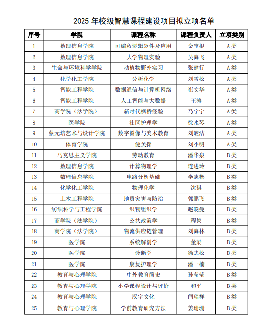 经教师个人申报、学院推荐、学校专家组评审,学校拟立项“中外教育简史”等25门课程为2025年校级智慧课程建设项目,教育与心理学院共有四门课程被推荐立项(推荐名单请见附件)。详见校网通知《关于2025年校级智慧课程建设项目立项名单的公示》https://info.usx.edu.cn/content.jsp?urltype=news.NewsContentUrl&wbtreeid=1002&wbnewsid=71549