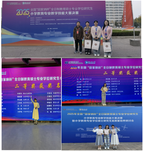 2025年10月25日,在山东聊城举办的全国“田家炳杯”全日制教育硕士专业学位研究生小学教育领域教学技能大赛决赛中,由来自全国104所院校的278名选手参赛,我院杜海平老师带队小学教育方向2023级徐榕晨、许梦丹、张广宁同学参加比赛。经过激烈角逐,徐榕晨、许梦丹同学获全国二等奖,张广宁同学获全国三等奖,这是继2024年我院小学教育方向研究生斩获该赛事全国一等奖1项、三等奖1项之后,再为学院增光添彩!