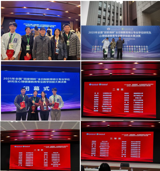 2025年10月16日,在东北师范大学举办的全国“田家炳杯”全日制教育硕士专业学位研究生心理健康教育领域教学技能大赛决赛中,由来自全国90所院校的192名选手参赛,我院刘萍老师带队心理健康教育方向2023级戴群森、2024级卢力帅、房映雯参加比赛。经过激烈角逐,戴群森、卢力帅同学获全国二等奖,房映雯同学获全国三等奖。