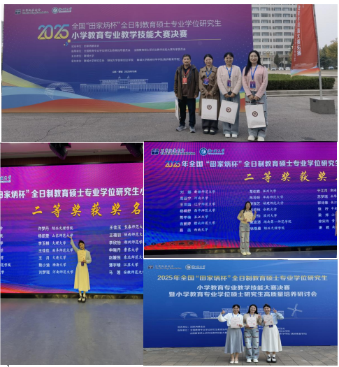 2025年10月25日,在山东聊城举办的全国“田家炳杯”全日制教育硕士专业学位研究生小学教育领域教学技能大赛决赛中,由来自全国104所院校的278名选手参赛,我院杜海平老师带队小学教育方向2023级徐榕晨、许梦丹、张广宁参加比赛。经过激烈角逐,徐榕晨、许梦丹同学获全国二等奖,张广宁同学获全国三等奖!
