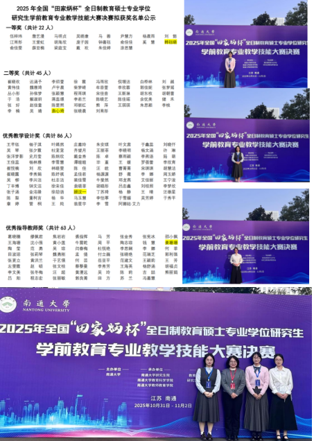 在2025年10月31日至11月2日举行的全国“田家炳杯”全日制教育硕士专业学位研究生学前教育专业教学技能大赛决赛上,南通大学见证了来自全国各地的86所院校共221名选手的精彩对决。我院由姜珊珊老师领队,学前教育方向硕士生2024级韩钰晓、袁心琦、顾沈一3位同学代表参赛。经过紧张激烈的比拼,韩钰晓同学脱颖而出,荣获全国一等奖;袁心琦同学紧随其后,荣获全国二等奖;顾沈一荣获“优秀教学设计奖”。这一骄人成绩充分展现了我院学前教育专业的办学实力和人才培养水平,创下了该专业方向的历史最佳参赛表现!