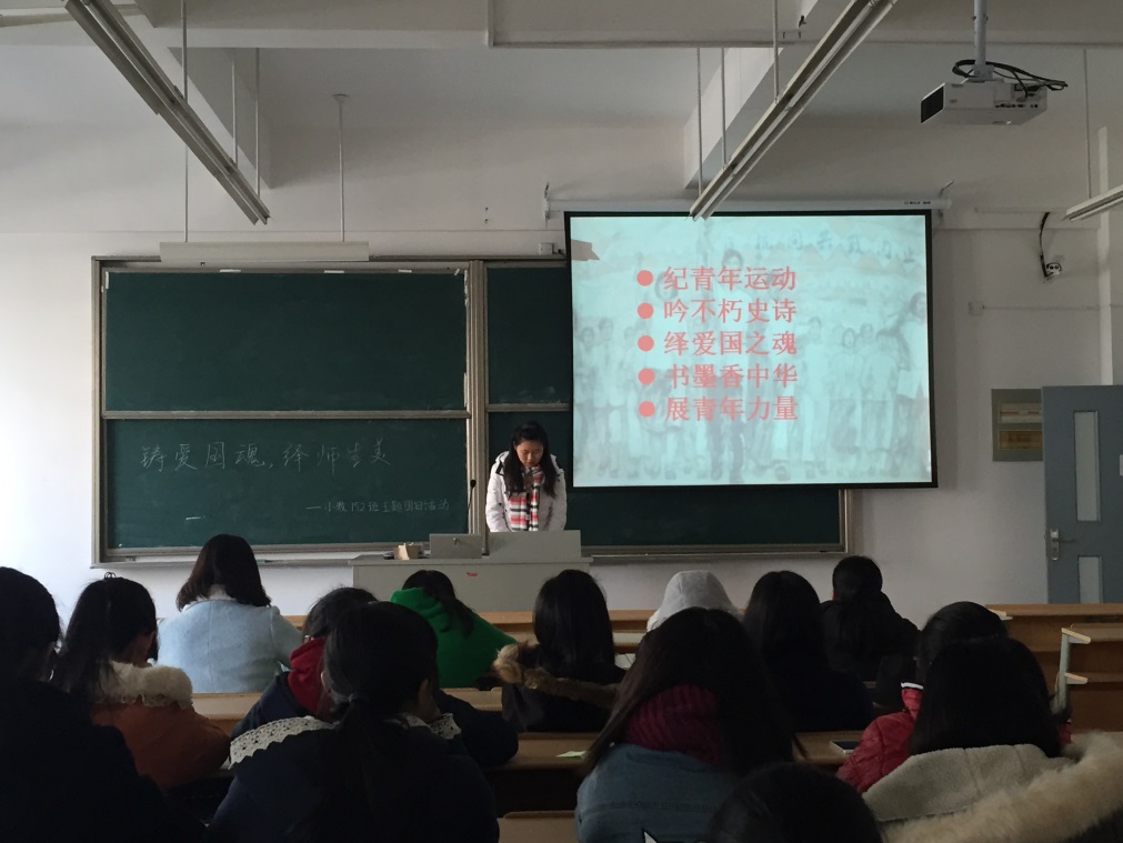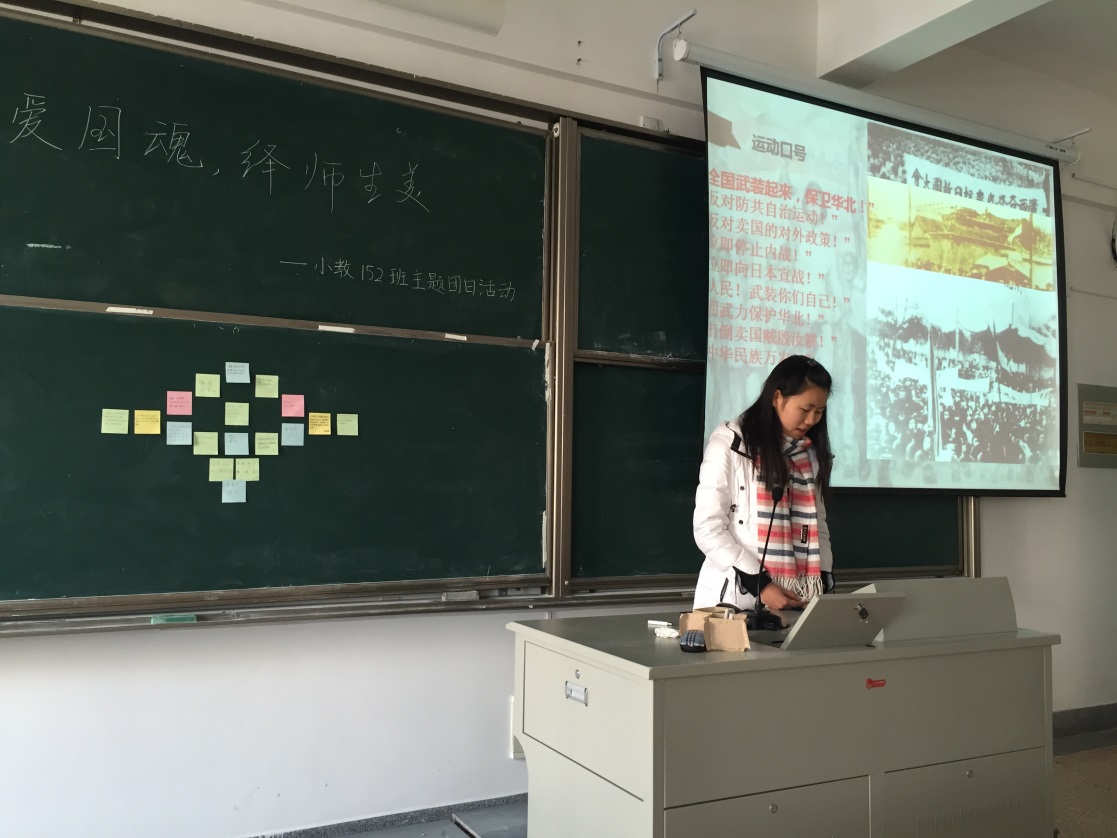 为了纪念12.9运动八十周年,弘扬爱国主义精神,激发同学们的公民意识和社会责任感,12月8日下午,我院小教152班于元培6幢408教室开展了“铸爱国魂,绎师生美”的主题团日活动。活动在小教152班宣传委员强雪雯的组织下顺利开展。