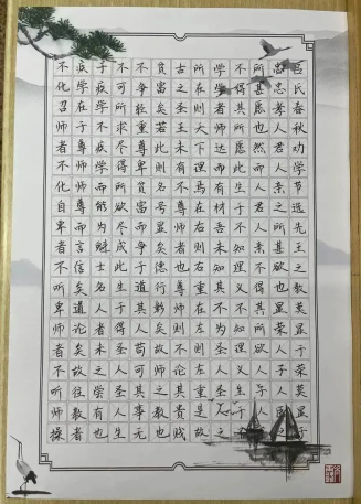 “不积跬步,无以至千里;不积小流,无以成江海。”日积月累,方能铸就师梦。本组选手誊抄《吕氏春秋·劝学》,他们谨记“锲而不舍,金石可镂”的道理,将“学高为师,身正为范”明了于胸,在点滴积累中将知识汇成渊博的海洋,以学而不厌成就诲人不倦。