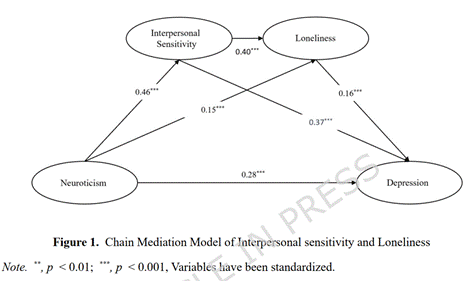 该研究聚焦于青少年抑郁的发生机制,系统考察了神经质人格与抑郁症之间的内在关联。研究通过对511名门诊就诊的青少年进行调查,采用艾森克人格问卷(Eysenck Personality Questionnaire, EPQ)、症状自评量表(the Symptom Checklist-90, SCL-90)中的人际敏感分量表、伊利诺伊孤独量表(the Illinois Loneliness Questionnaire)及抑郁自评量表(Zung’s Self-Rating Depression Scale,SDS),构建了一个链式中介模型。研究发现,神经质不仅能够直接正向预测青少年抑郁,还通过人际敏感性和孤独感的中介作用间接影响抑郁。具体而言,神经质水平高的青少年更容易在人际互动中体验到敏感和不适,进而产生孤独感,最终导致抑郁症状的加重。该研究的创新之处在于,在门诊就诊的青少年样本中阐明了神经质人格影响青少年抑郁的作用机制。研究结果不仅深化了对神经质与抑郁之间关系的理论认识,也为制定针对性干预策略提供了依据。