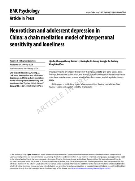 绍兴大学心理学系顾丽佳博士于2026年2月以第一作者身份在SSCI来源期刊《BMC Psychology》上在线发表题为“Neuroticism and adolescent depression in China: a chain mediation model of interpersonal sensitivity and loneliness”的学术论文,温州医科大学孙雨圻博士、中国科学院心理研究所王玉正博士为共同通讯作者。