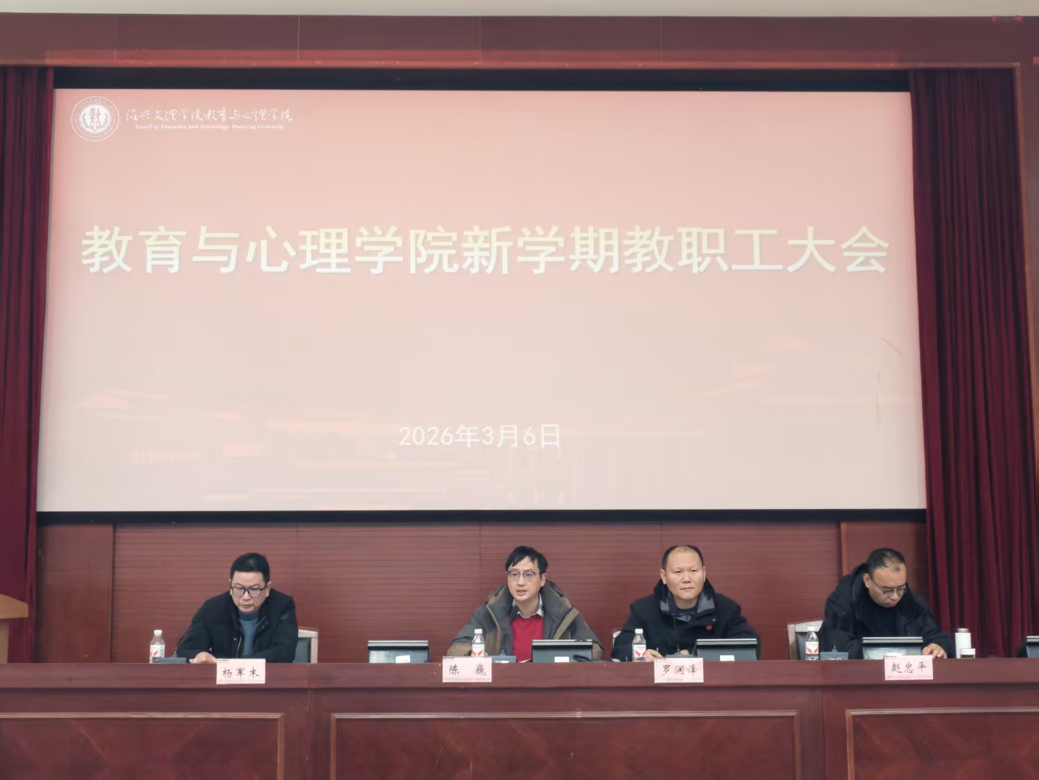 3月6日中午,教育与心理学院在南山校区7号楼报告厅召开新学期教职工大会。院长陈巍,党委书记罗润锋,党委副书记杨军木,副院长赵忠平,各系、科室负责人及全体教职工参加会议。会议由罗润锋主持。