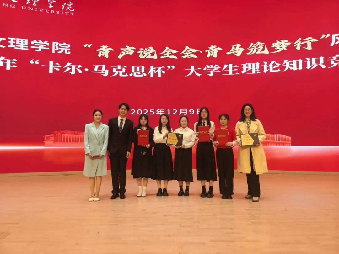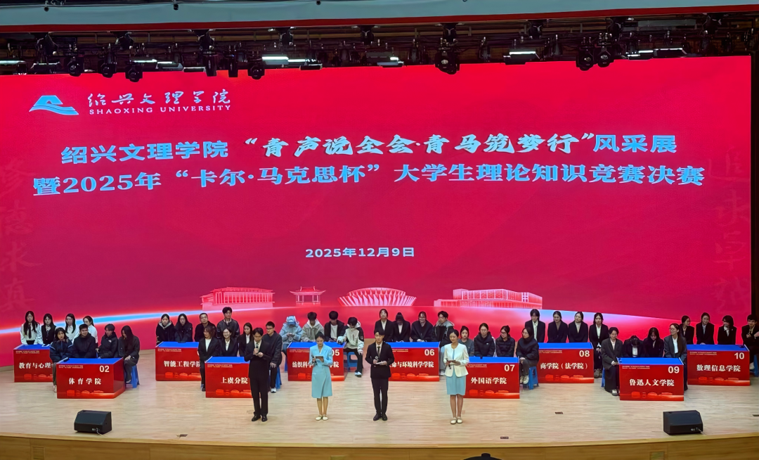 12月9日晚,绍兴文理学院“青声说全会·青马筑梦行”风采展暨2025年“卡尔·马克思杯”大学生理论知识竞赛决赛在风则江大讲堂成功举办。凭借扎实的知识积淀与亮眼的现场发挥,我院参赛团队脱颖而出,荣获集体赛二等奖,宣讲员盛茵琪获思政微课三等奖,指导老师石峻华荣获优秀指导老师奖。