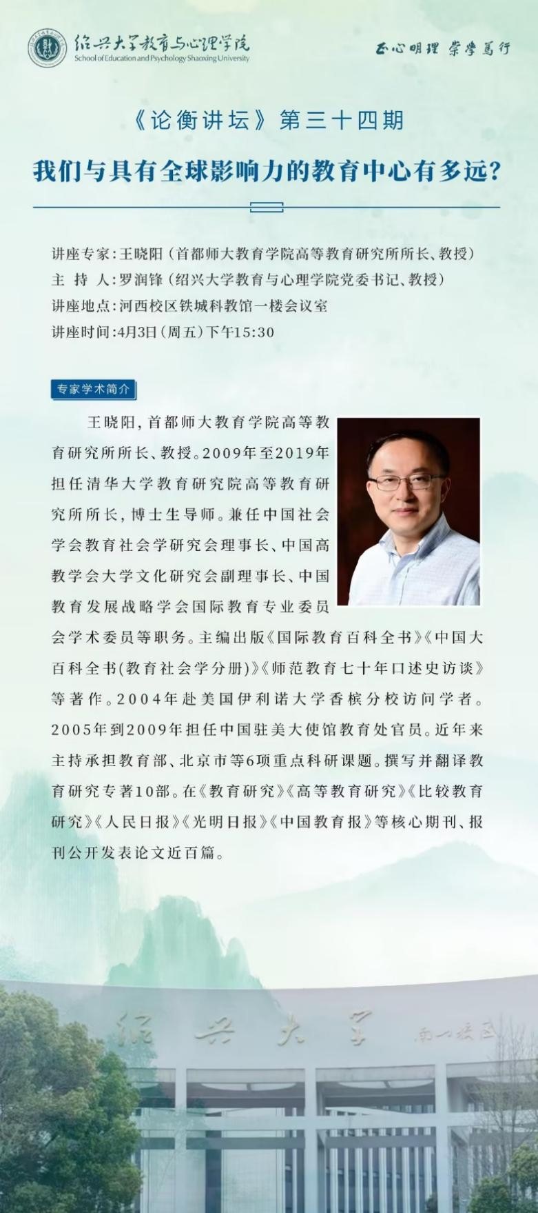 在“十五五”规划开启的历史节点,面对世界百年未有之大变局,中国高等教育将如何破局?我们距离具有全球影响力的教育中心究竟还有多远?2026年4月3日下午,我院《论衡讲坛》第三十四期于河西校区铁城科教馆一楼会议室顺利举行。本期讲座特邀南南国际教育研究院院长、清华大学高等教育研究所原所长、首都师大教育学院高等教育研究所所长王晓阳教授担任主讲嘉宾,教育与心理学院党委书记罗润锋教授主持,学院相关负责人及多名师生现场聆听了讲座。