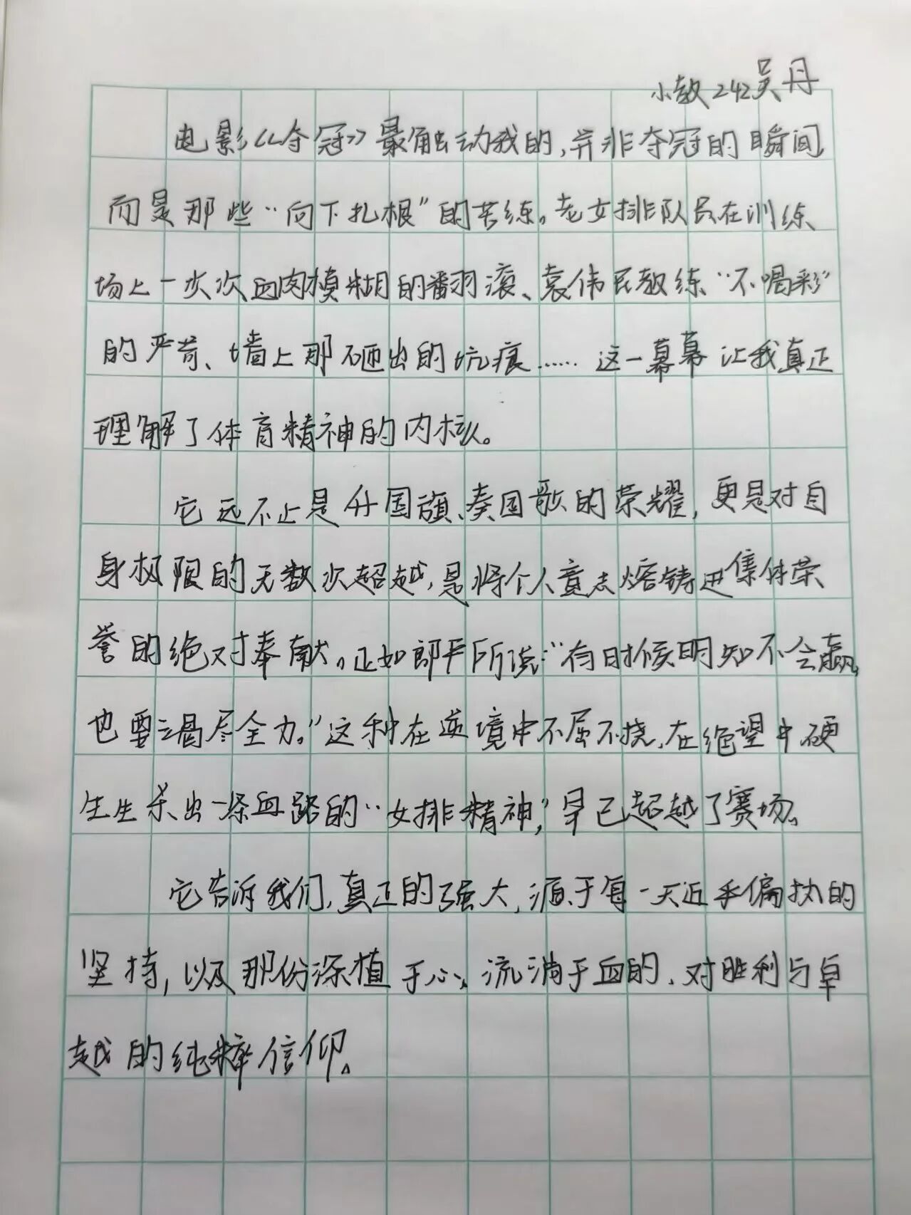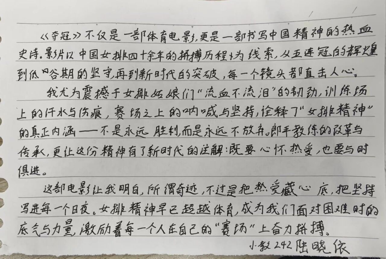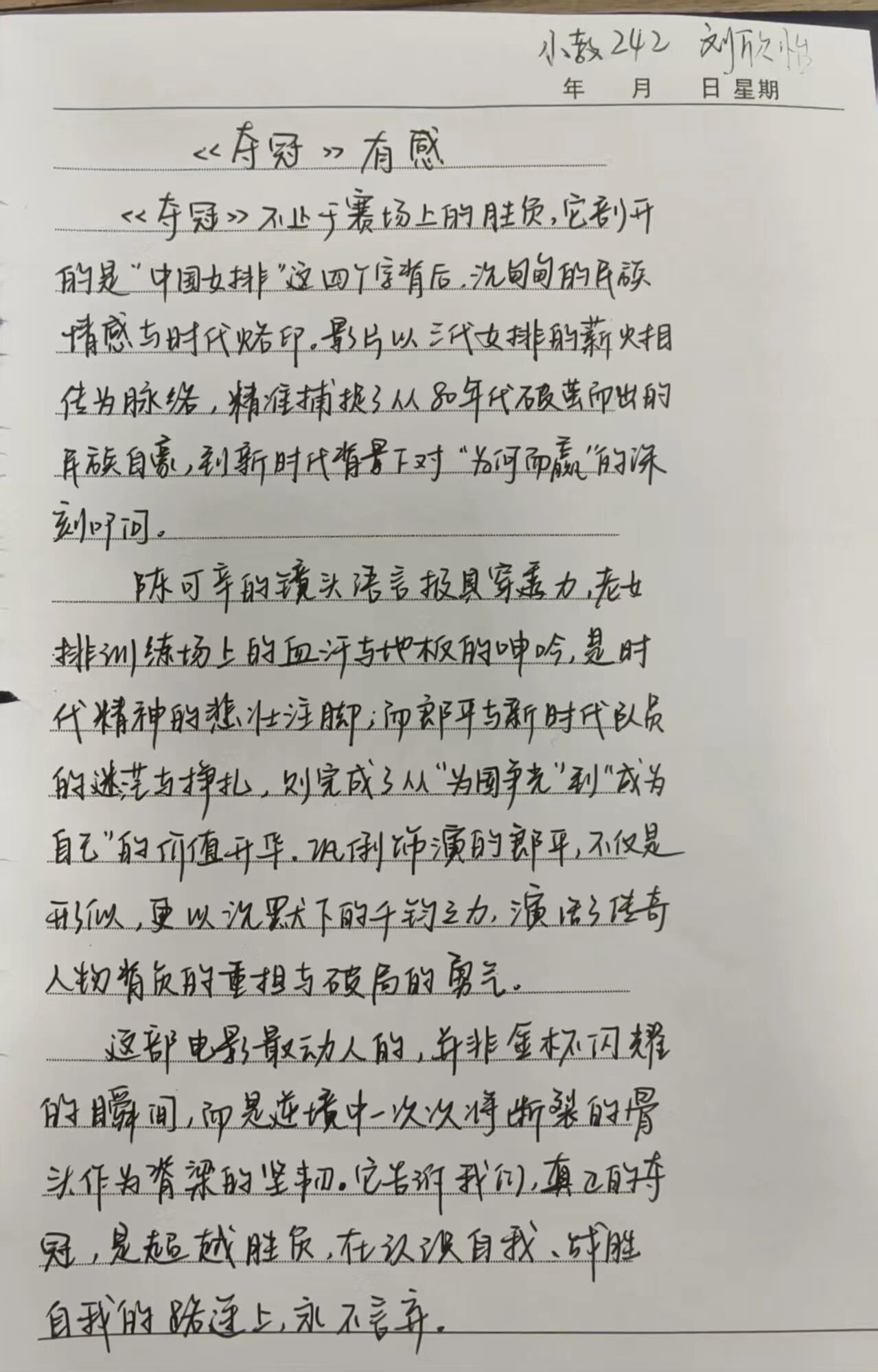 支部成员集体观看影片《夺冠》,在中国女排数十年奋斗历程的震撼画面中感受拼搏与信念的力量。观影后,同学们写下观后感,将情感共鸣转化为思考。影片中“困境中不放弃、低谷中见精神”的女排精神在同学心中产生深刻触动,进一步激发了奋进动力。