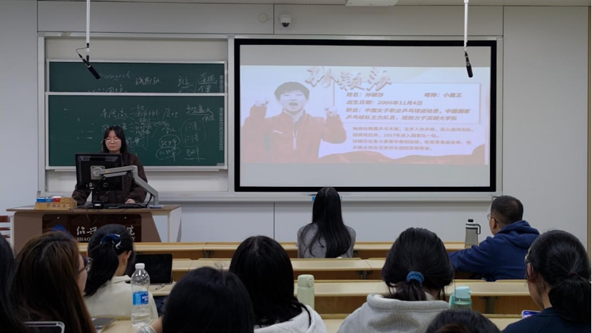 团支书分享“青春榜样孙颖莎”的成长经历,从启蒙训练、青少年赛事到世界赛场的突破,重点介绍“莎头组合”在国际大赛中的默契配合与抗压表现,展现新时代运动员的奋斗姿态。同学们也分享了心中的体育榜样,表达了向榜样学习的愿望,现场氛围热烈。