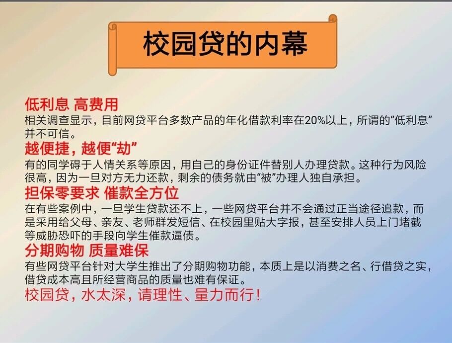 近段时间,贷款广告在校园里泛滥,贷款公司提出“无担保、无抵押,当日放贷”等条件十分“诱人”,但贷款利率只字未提,对贷款用途也不审核,一些涉世未深的大学生一不小心就深陷其中,最后导致债台高筑。