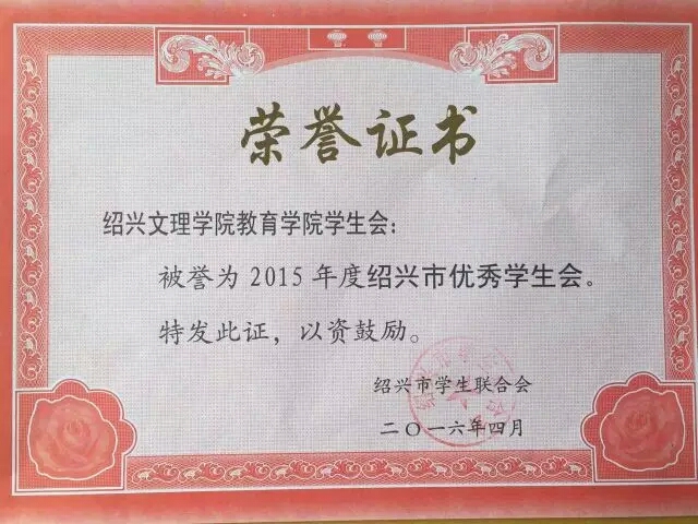 2015学年,我院学生会在学院学生工作领导小组的领导下,紧紧围绕学校中心工作,以立德树人为核心,以服务学生为出发点和落脚点,秉承“学高为师,身正为范”的培养理念,深入学习贯彻习总书记系列重要讲话精神,不断深化育人工作体系,带领全院青年为学校改革和发展贡献力量。因此,在绍兴市优秀学生会的评选中,我院学生会凭借在自身建设、思想政治教育、校园文化建设、课外学术科技活动、社会实践活动等方面取得的显著成绩,突破重重考验,最终被评为“2015年度绍兴市优秀学生会”。