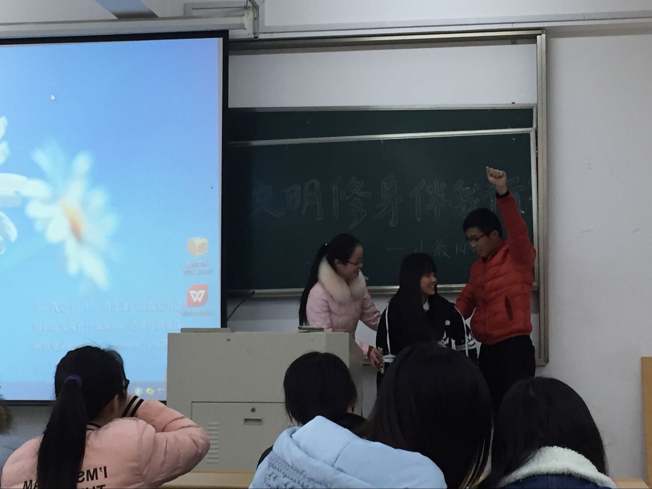 在主题团日班会上,以寝室为单位的各个小组分别派代表讲解自己所学习到的文明礼仪知识,其中包括个人礼仪、社交礼仪、家庭礼仪、校园礼仪、求职礼仪、公务礼仪和涉外礼仪。这些礼仪看似平常,但都是我们日常生活中所需要掌握的。同学们在积极学习了各类礼仪后,从自身为出发点,以利于今后自己的成长和发展为目标进行了深刻的思考。最后,小品《公交车上》引得同学们欢笑阵阵,也同样引发了同学们对公交车上让座这一问题的思考。