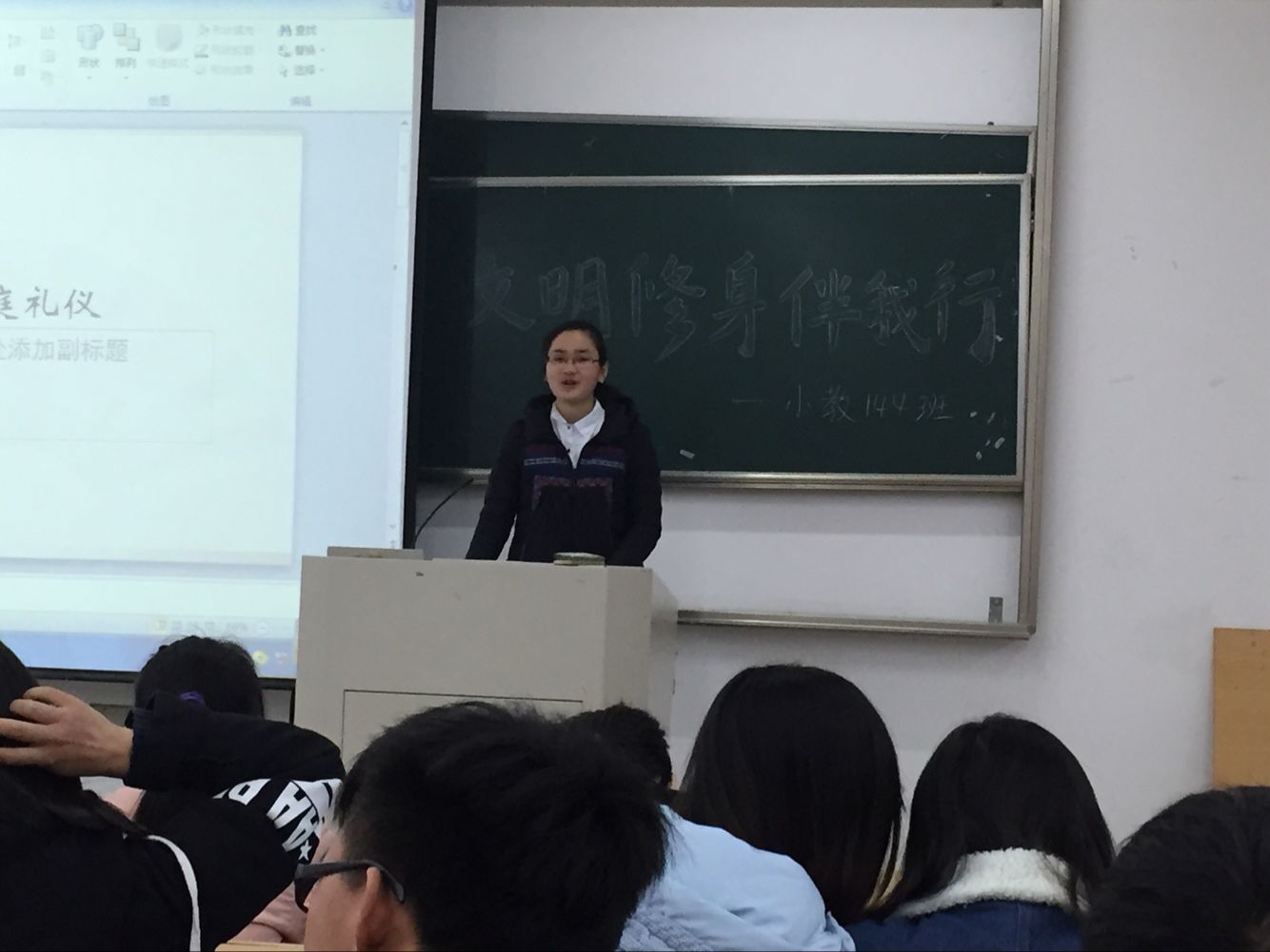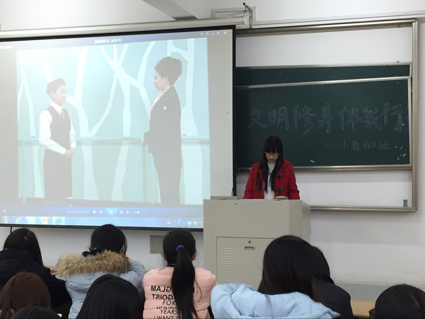 为响应学院号召,全面贯彻“文明修身伴我行”,小教144班组织了一系列活动以提高班级同学自身的文明修养,其中包括校园清洁、寝室美化、学习各类文明礼仪等。