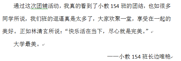 此次团辅的开展,在促成广大新生健全人格、形成良好的个性心理品质,促使其内心世界的丰富、精神生活的充实、潜能的发挥与体现正确的人生观方面发挥了积极的影响。