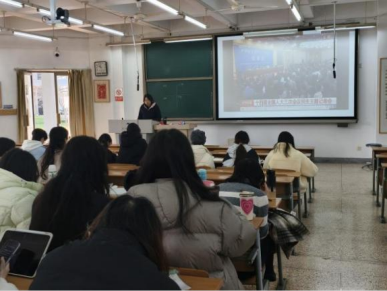 团支书以就业形势研判为切入点,开场播放2025年人社部就业形势分析视频,同步分享当前就业市场的相关数据,快速营造聚焦职业规划、深度交流探讨的氛围;随后组织“就业观念大家谈”小组讨论,各小组推选代表上台发言,围绕职业规划的价值、就业选择的关键考量等核心话题,分享各自的理解与思考,在思想碰撞中凝聚共识。