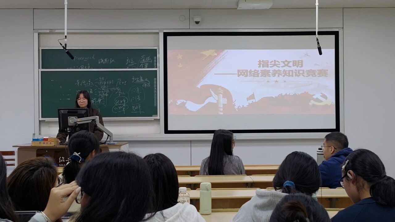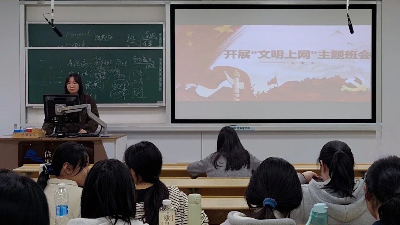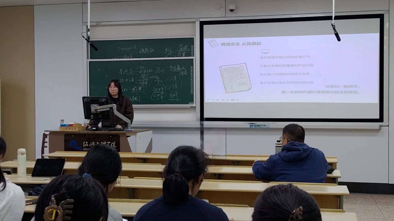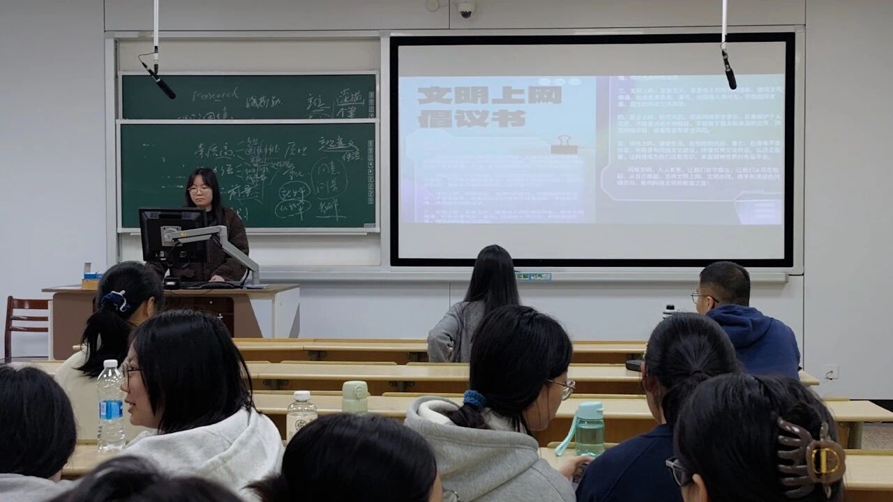 团日活动开始前,团支书给同学们宣读了此次活动的背景、开展的目的及相关细节。活动开篇以主题班会形式展开,团支书通过PPT系统带领同学们开展“文明上网”专题学习,围绕“网络文明传播者”“网络安全守护者”“网络安全宣传者”三大核心板块,层层递进讲解网络文明与安全知识。