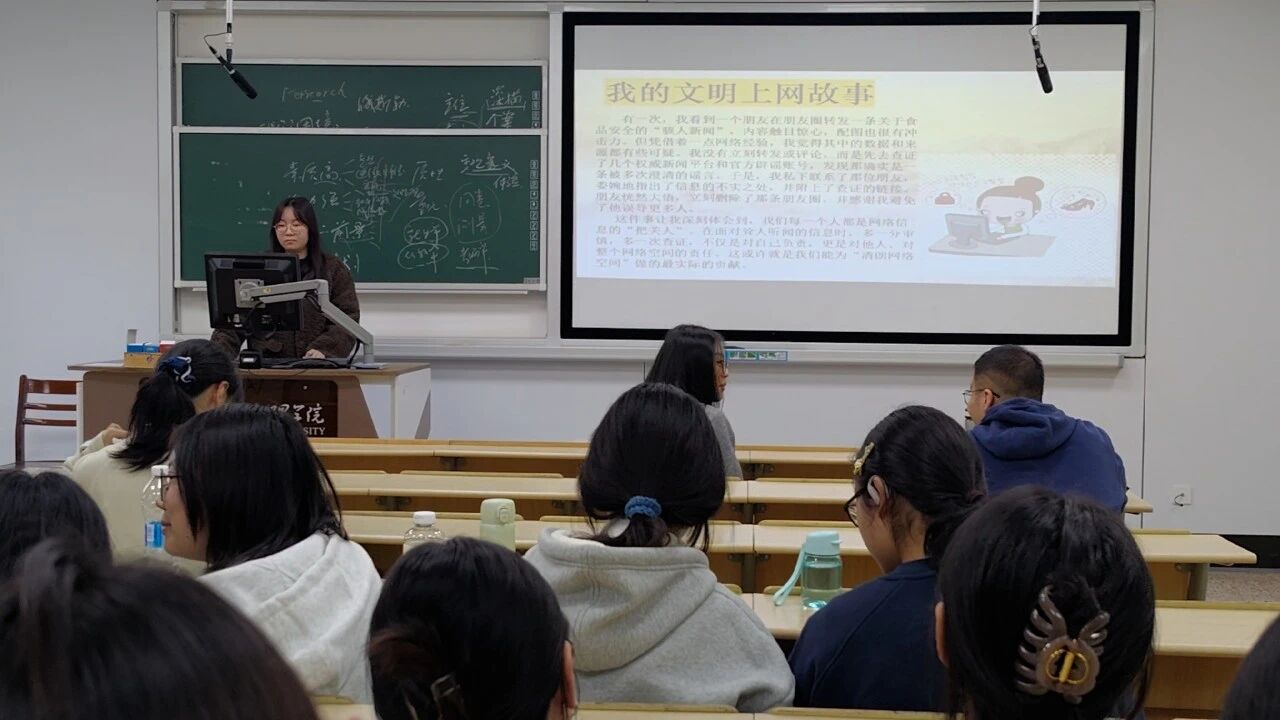 主题班会后,团支部组织分享会,邀请同学们结合自身经历交流文明上网故事与感悟。有同学分享了辨别食品安全谣言并劝阻朋友转发的经历,强调面对可疑信息需审慎查证。其他同学也纷纷分享日常上网中识别虚假信息、拒绝不良链接的经历,现场形成共鸣,深化了大家“主动守正、抵制不良”的上网理念。