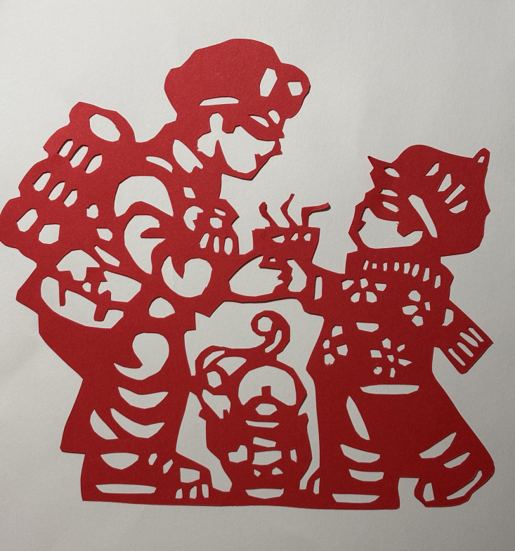 这幅剪纸以鲜艳红纸为底,“学习雷锋”四字醒目。中间雷锋形象跃然纸上,四周饰以精美花纹,(牡丹、松柏、山水)传承无私奉献精神。