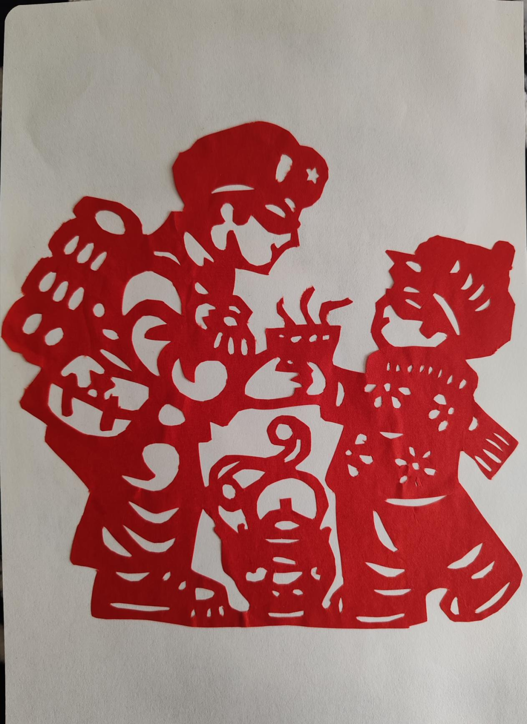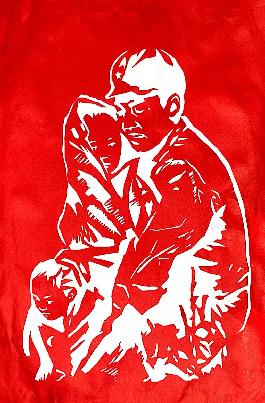 以质朴红剪刻画孩童向雷锋敬茶的场景,传递出军民一家的温情与雷锋精神的温度,尽显人间暖意。