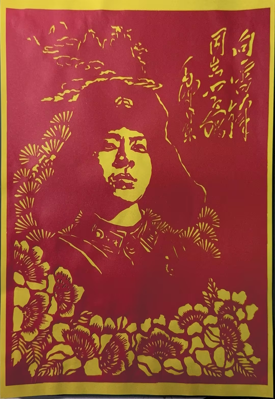 剪纸以雷锋形象为核心,搭配松梅与毛泽东主席题词,传递雷锋精神,致敬榜样力量,弘扬无私奉献的时代品格。