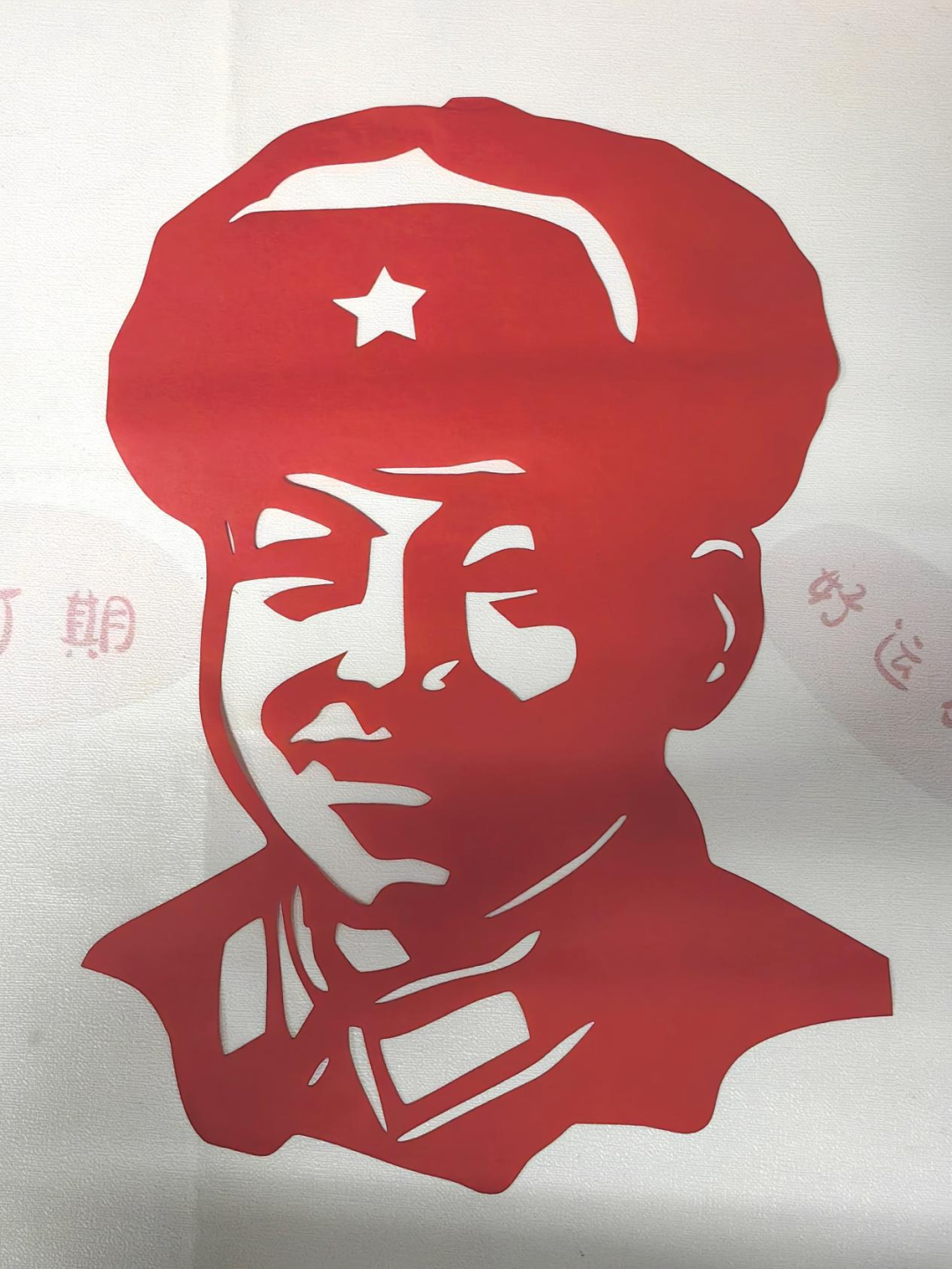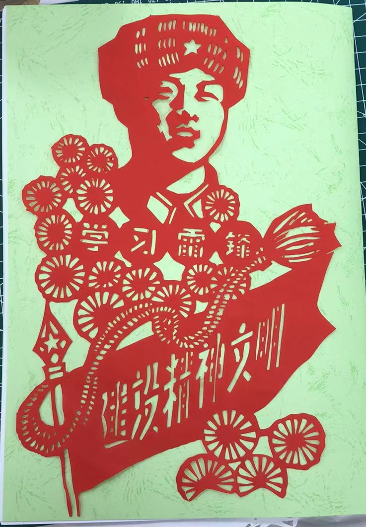 以简洁有力的线条勾勒出雷锋同志的经典形象,帽上红星熠熠生辉,用传统剪纸艺术传递助人为乐、无私奉献的雷锋精神。