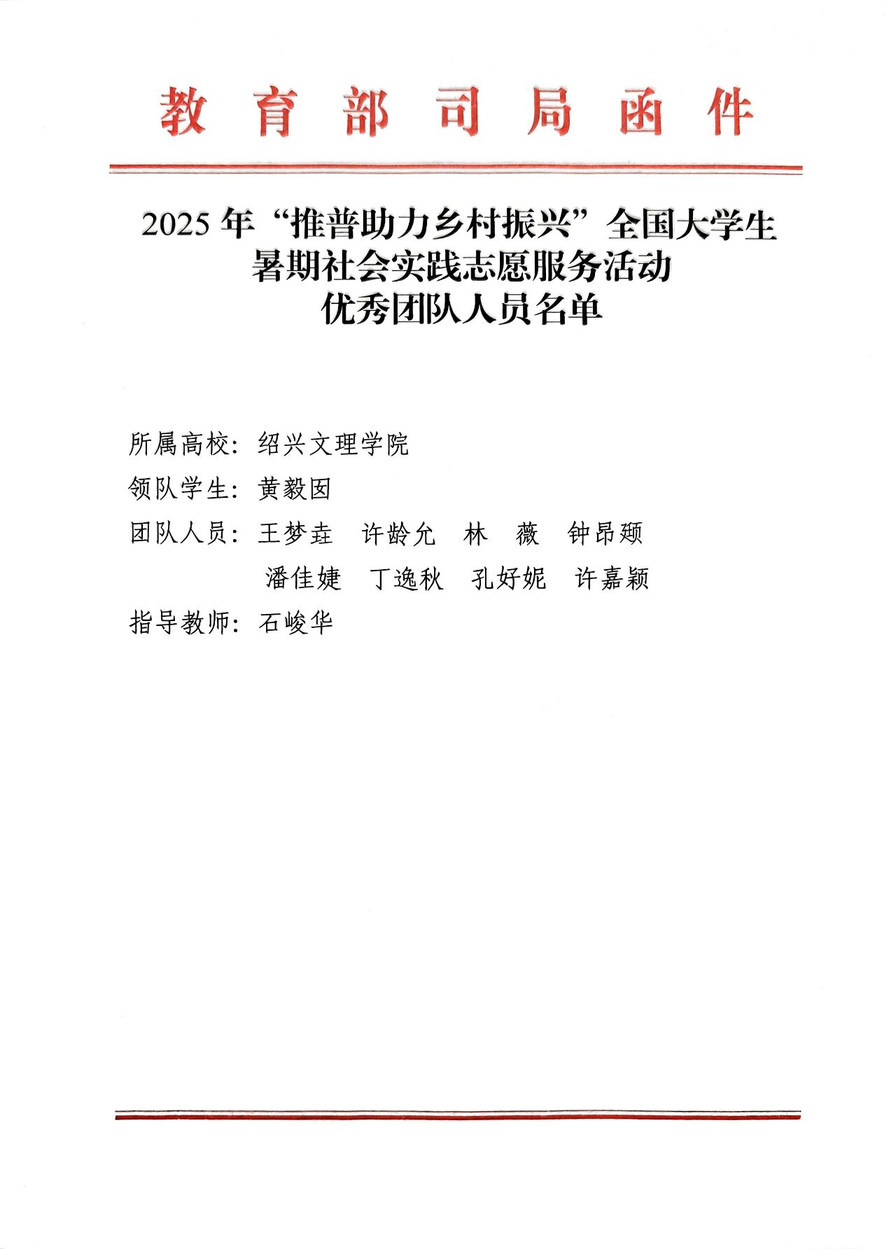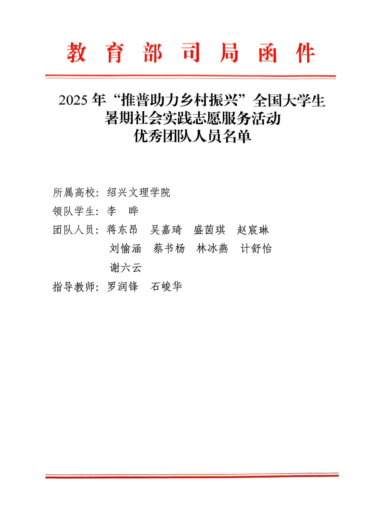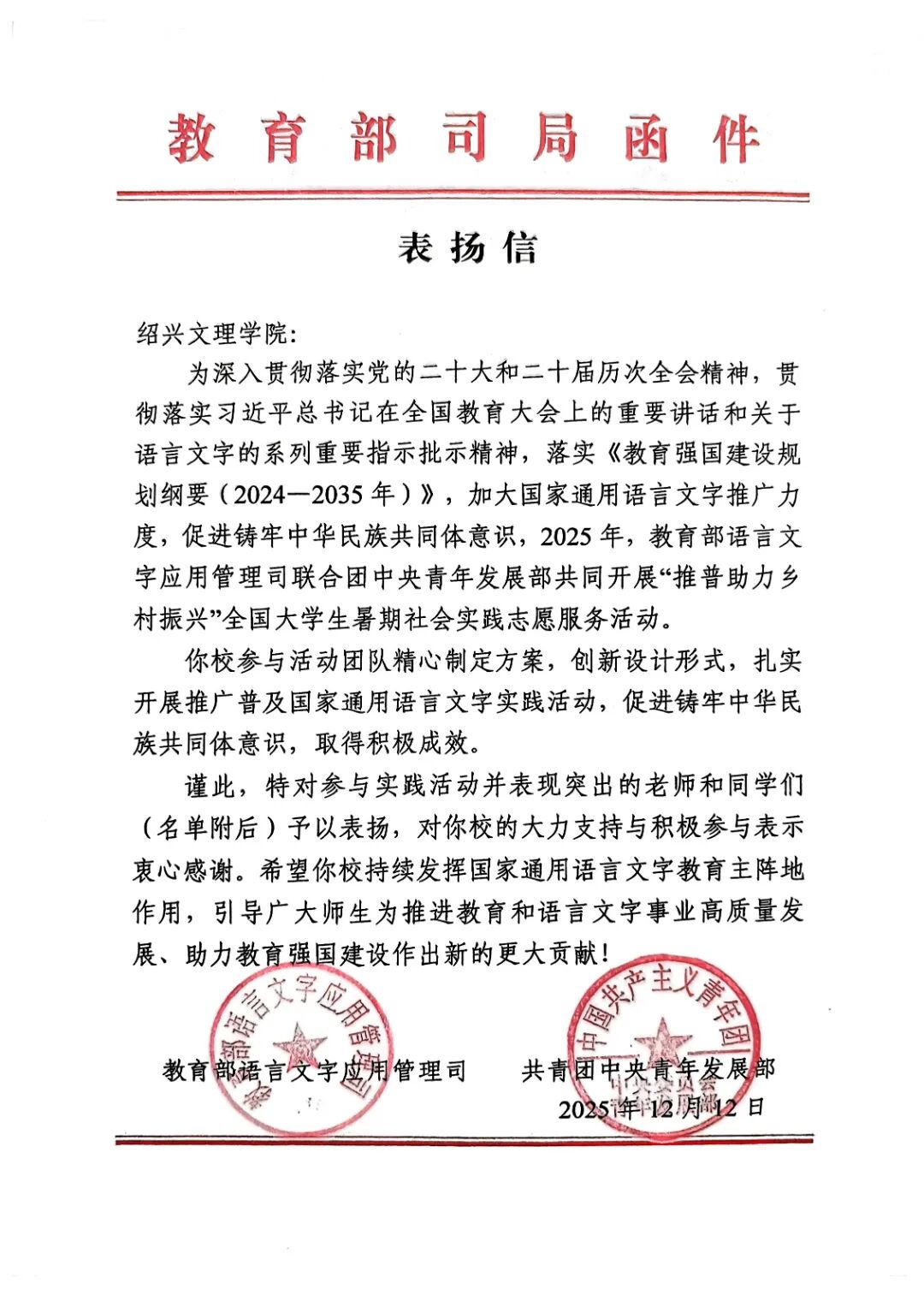 在2025年由教育部语言文字应用管理司、共青团中央青年发展部共同主办的“推普助力乡村振兴”全国大学生暑期社会实践志愿服务活动中,我院“山海同声”与“山花守望”两支社会实践团队,从全国1680所高校的8013支队伍中脱颖而出,获教育部、团中央联合致信表扬。本年度活动竞争激烈,共8万余名师生参与,经多轮评审,最终仅评选出200支“优秀团队”。两支队伍同时入选,充分体现了学院实践育人的扎实成效与青年学子服务国家的担当精神。